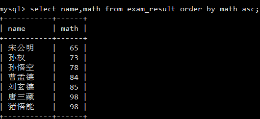 (1) 同学及数学成绩,按数学成绩升序显示(ORDER BY 默认升序)