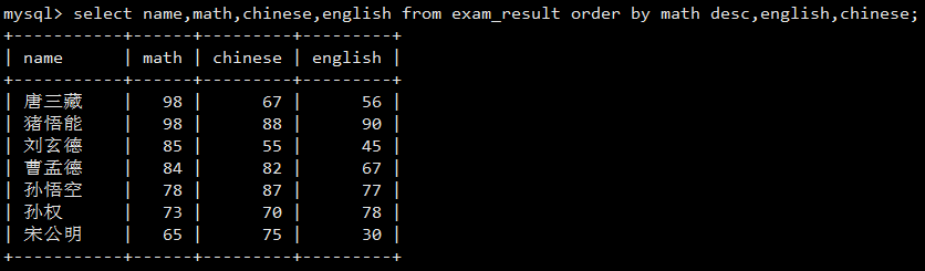 (2) 查询同学各门成绩,依次按 数学降序,英语升序,语文升序的方式显示