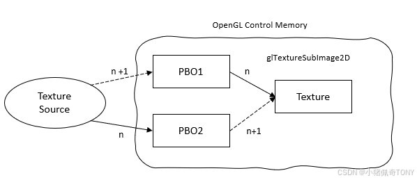 将图像数据加载到 PBO 之后,再将图像数据从 PBO 传输到纹理对象中完全由 GPU 进行控制,不会占用 CPU 的时钟周期时间,所以绑定 PBO 之后,执行 glTexImage2D 操作,CPU 无需等待,可以立刻返回