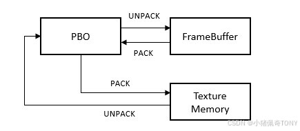 Opengl-es 的 PBO(Pixel Buffer Obejct), 也就是像素缓冲区对象,主要用于异步像素的传输操作, PBO 仅仅用做像素的一个暂存区,不连接到纹理,并且和 FBO(FrameBuffer Object) 无关