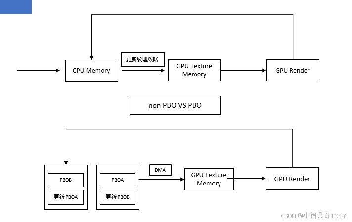 使用 PBO 可以在 GPU 和 GPU_VRAM 之间快速传输数据,使用的是 DMA 传输的方式,不占用 CPU 时间,而且PBO 也支持异步传输