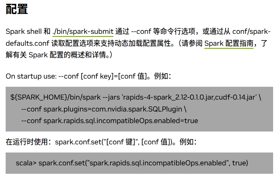 当然,--jars指示的这两个jar包还是要提前下载一下的,然后使用--conf或者config文件将需要启动gpu支持的参数告知spark-shell。