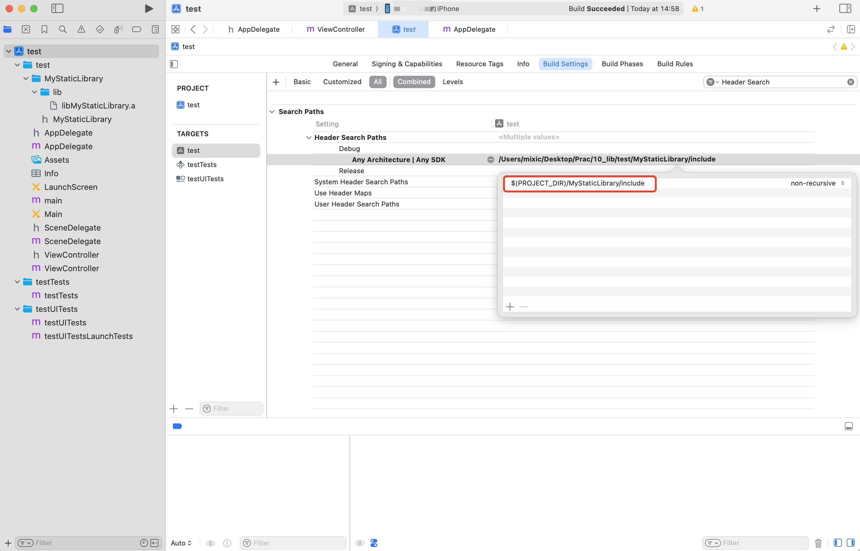 Header Search Paths = $(PROJECT_DIR)/MyStaticLibrary/include