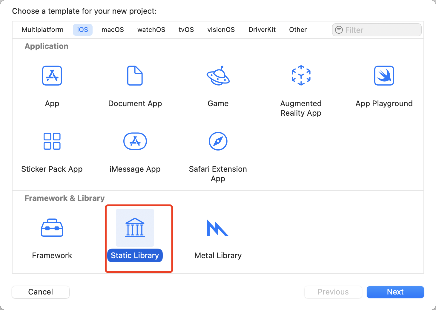 选择 Framework & Library → Static Library