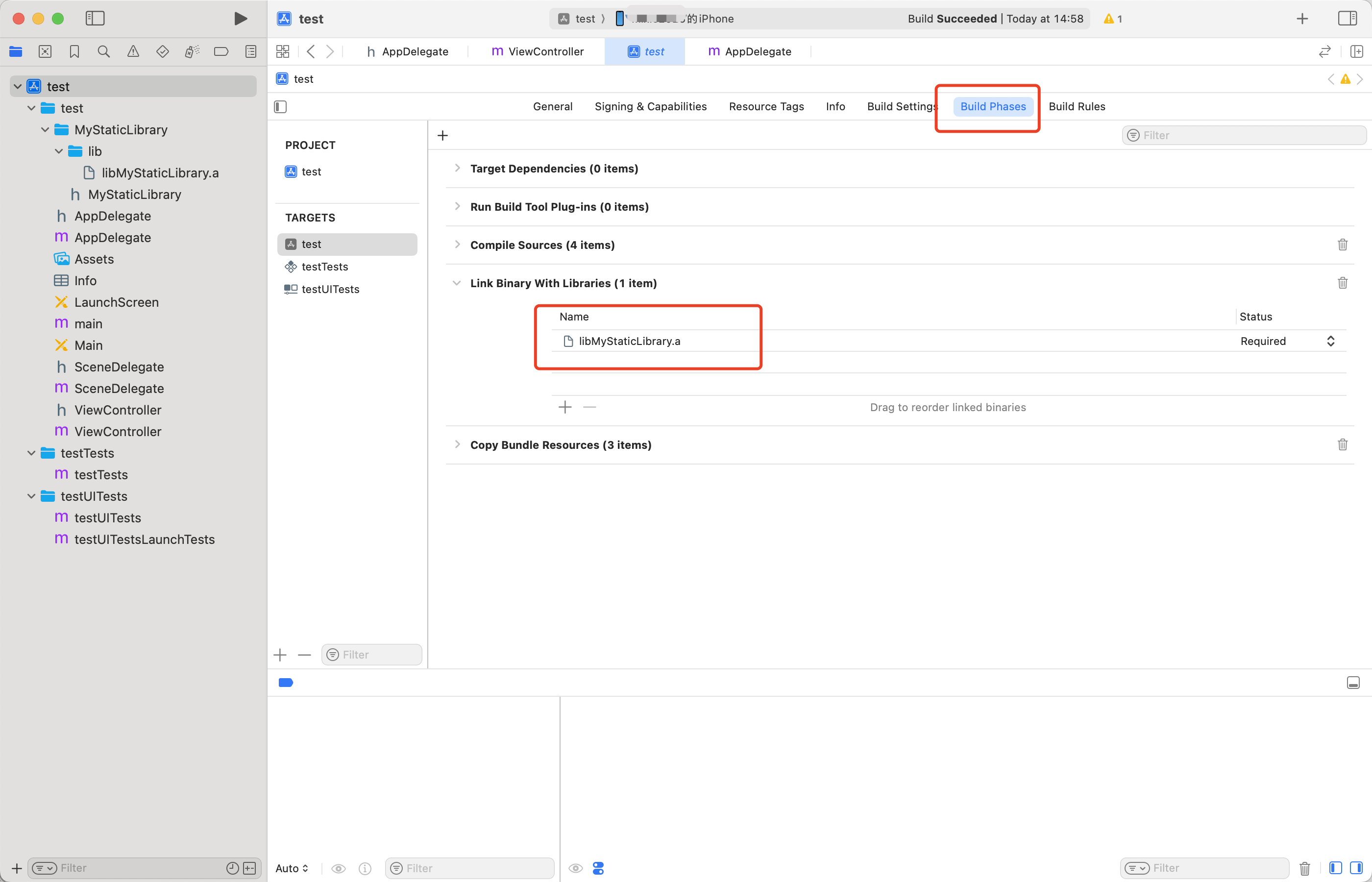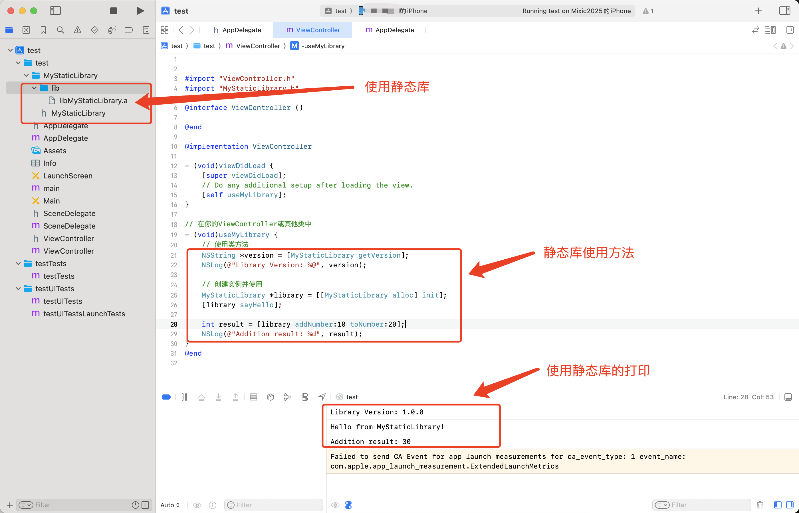 - 将 libMyStaticLibrary.a 和头文件拖拽到Xcode项目中