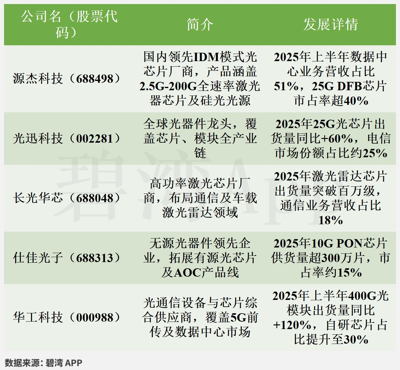源杰科技是国内光芯片领域龙头企业,2025年在25G DFB芯片领域国内市占率超40%,电信市场主导地位稳固。数据中心业务快速崛起,2025年上半年硅光CW光源出货量占全球市场约15%,相关营收同比激增1034%,综合排名位居国内前三。