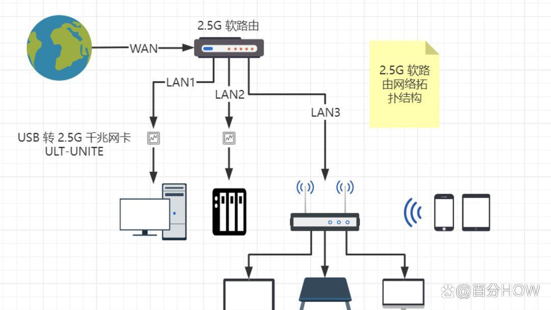 如果有超过两台的 2.5G 设备,那肯定是要买一台 2.5G 的交换机的,一般来说。LAN1 作为软路由的管理口,接电脑,防止软路由系统出问题后进不了后台,再用一个 LAN 口接交换机,剩下所有设备都接到交换机上。