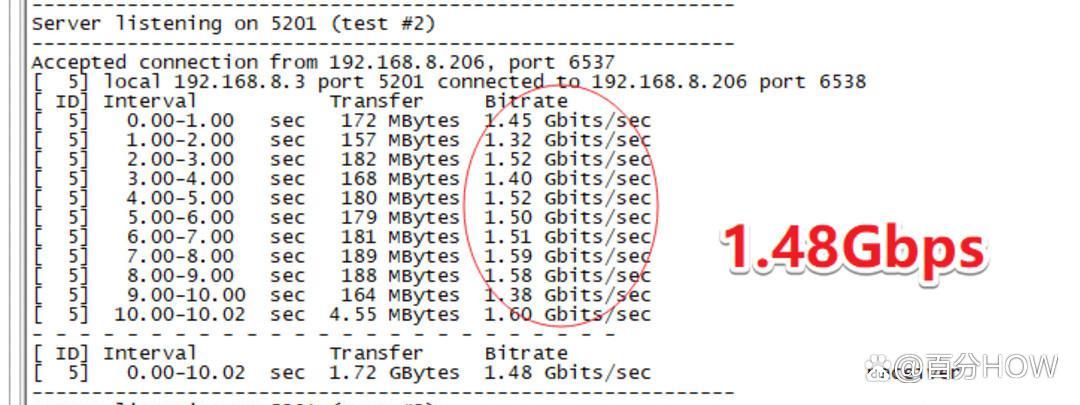 下面就用 iperf 工具来测试 TCP 吞吐量(带宽测试):为了确定网卡的最大吞吐量,可以在任意客户端运行 iperf 命令,iperf 将尝试从客户端尽可能快地向服务端发送数据请求,并且会输出发送的数据量和网卡平均带宽值。