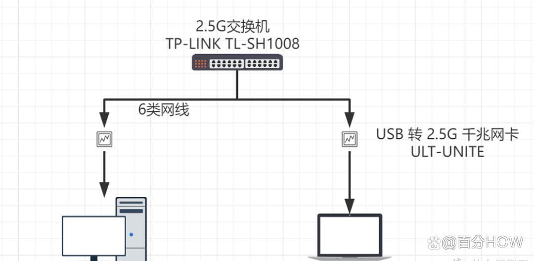 将两块 ULT-unite USB 2.5G 网卡分别插到电脑和 NAS,连接到 2.5G 交换机上。