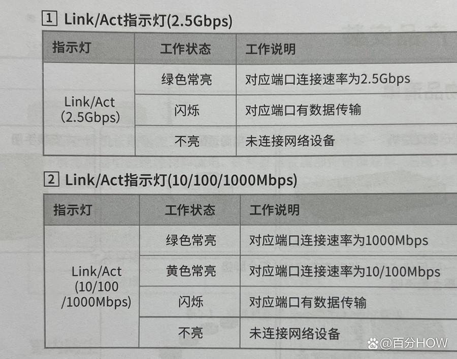 好在交换机的说明书里有详细的灯的颜色说明,以下是**「2.5G 网口指示灯颜色含义」**的权威说明: