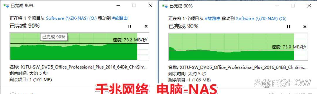 电脑和 NAS 之间互传文件,速度稳定在 73MB/s,离千兆带宽(110MB/s)的速度还差一些。刚买回来那会读写测试结果有 100MB/s。