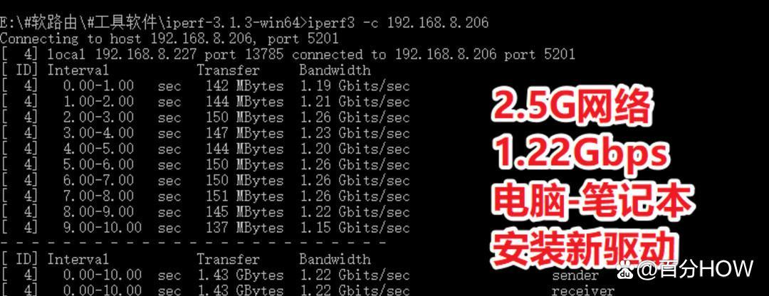 两台电脑插上 2.5G USB 网卡,连接到 2.5G 交换机上,装完驱动后测试带宽为 1.22Gbps。