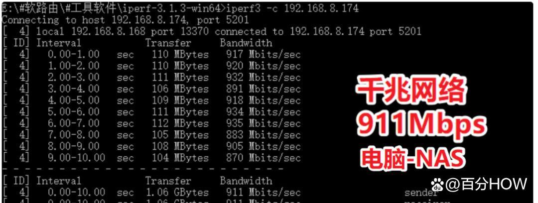 在 NAS 上运行 iperf3 作为服务端,电脑作为客户端,实测带宽 911Mbps,基本接近千兆。