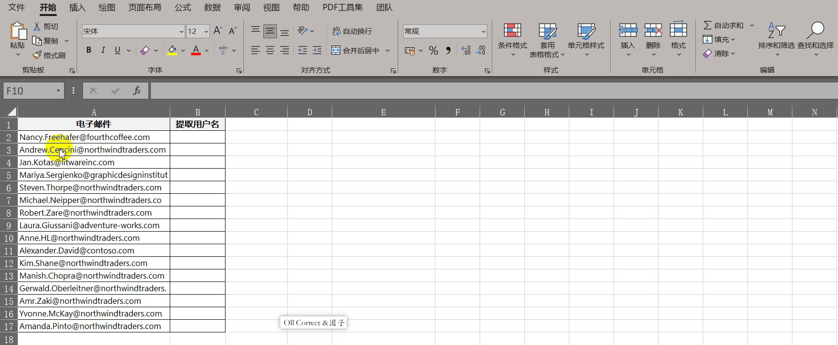 (1)手动选中第一个用户名,复制(Ctrl+C):在 "提取用户名" 列的第一个单元格中粘贴(Ctrl+V)对应的用户名(如Nancy.Freehafer),按Enter键;