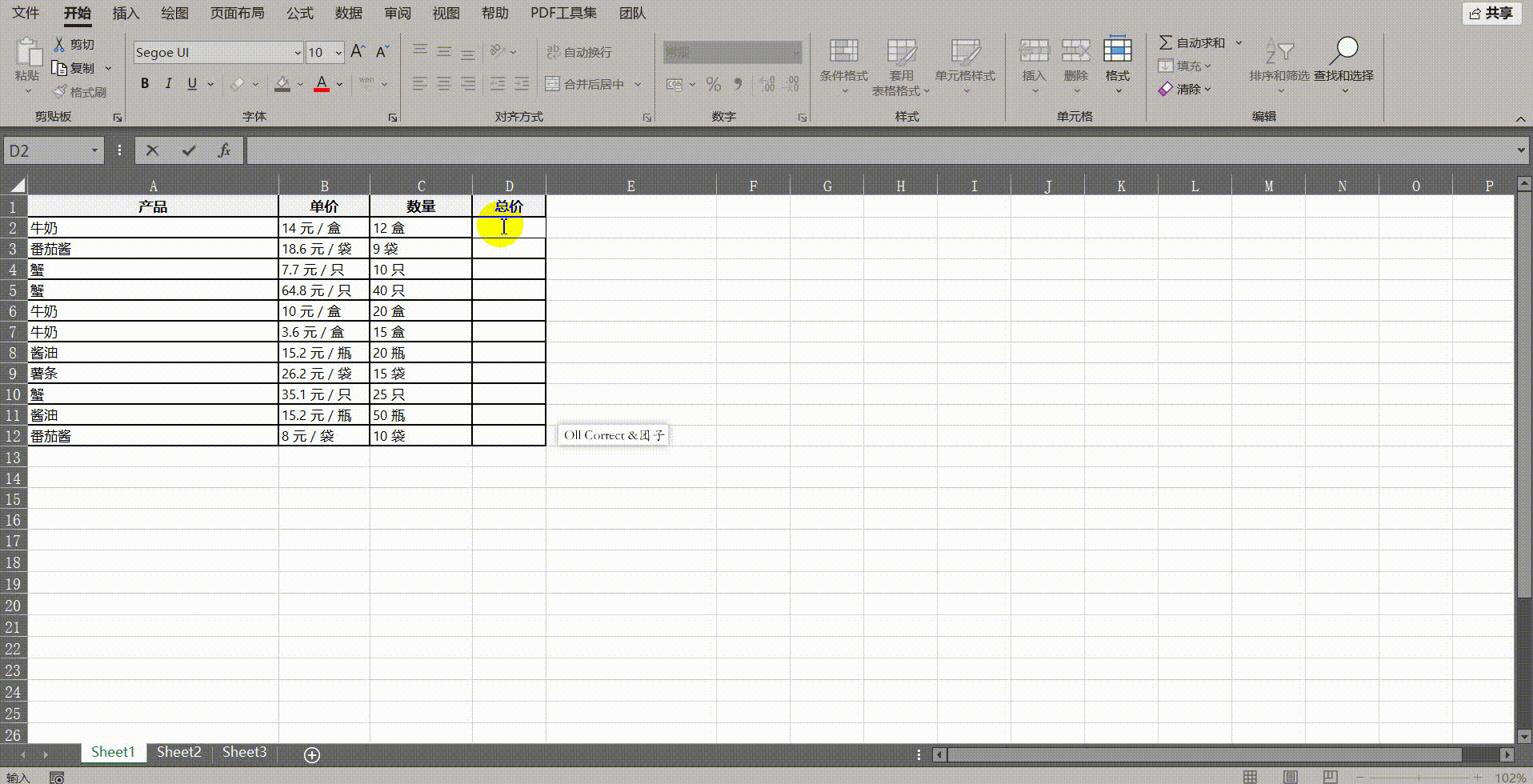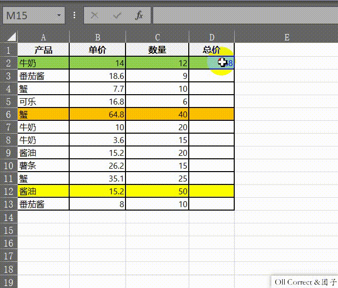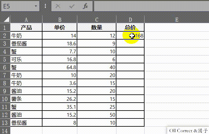 (5)选中该单元格,按住Ctrl+E,Excel会智能识别运算规律,批量填充剩余行的总价。
