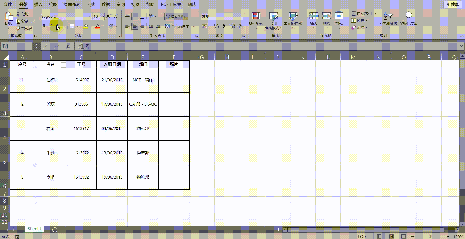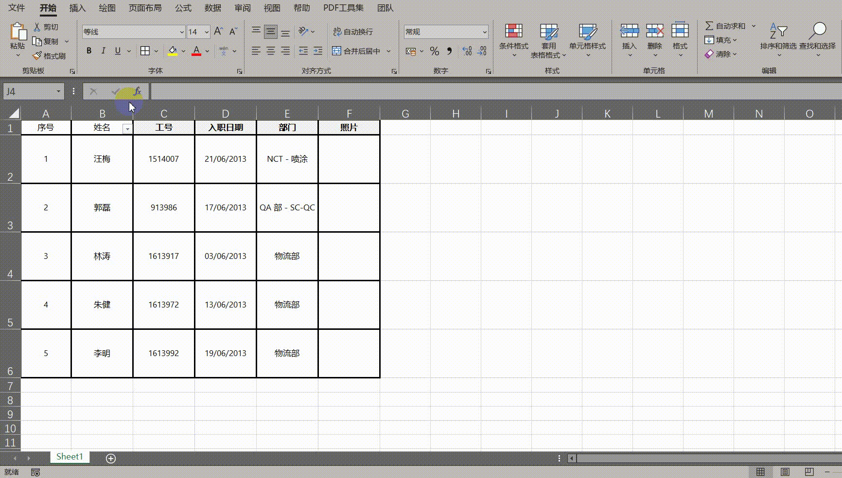 | 序号 | 姓名 | 工号 | 入职日期 | 部门 | 照片 |