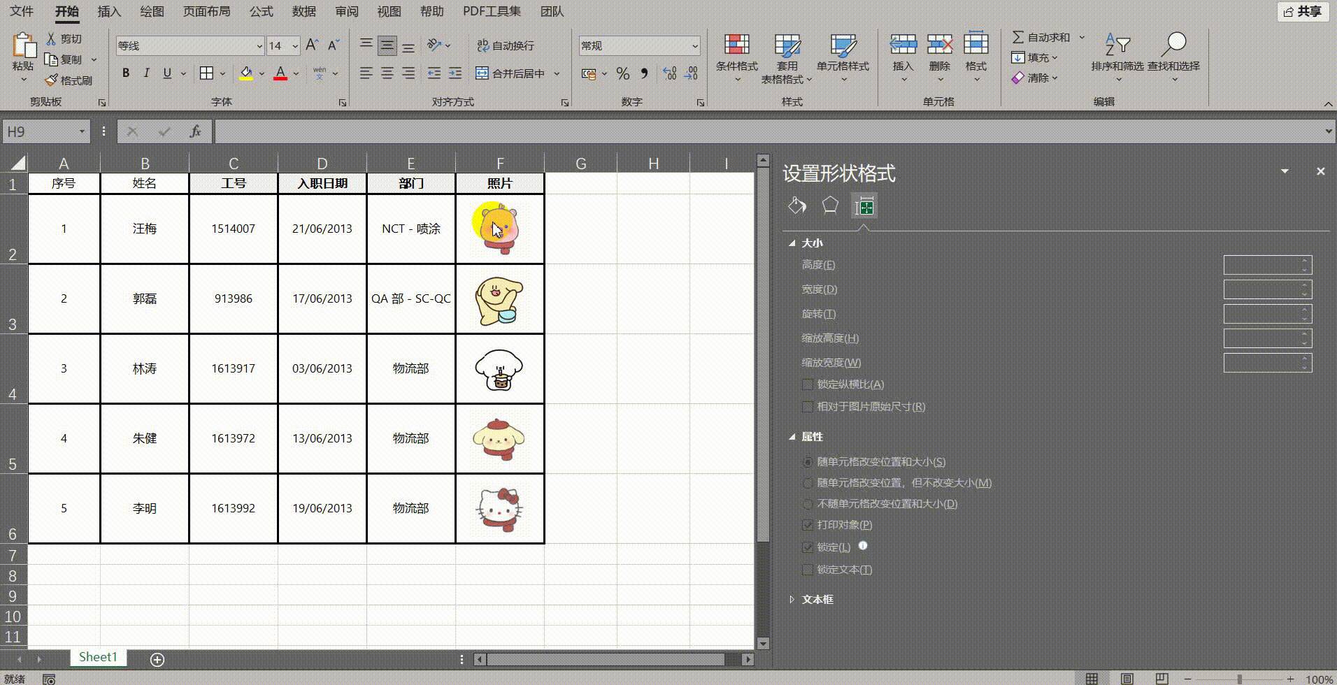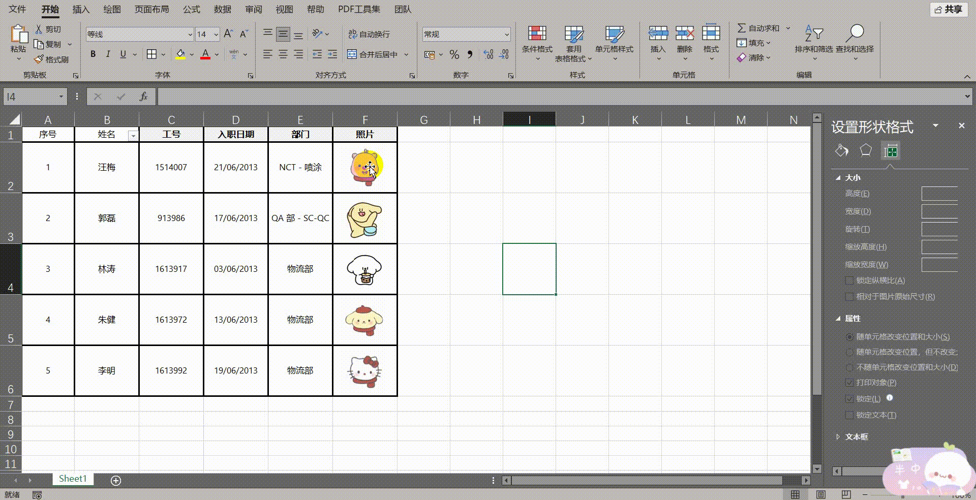(5)图片属性最终设置:右键单击任意一张图片→【大小和属性】→【属性】→选择 "随单元格改变位置和大小",确保后续操作中图片与单元格同步变化。
