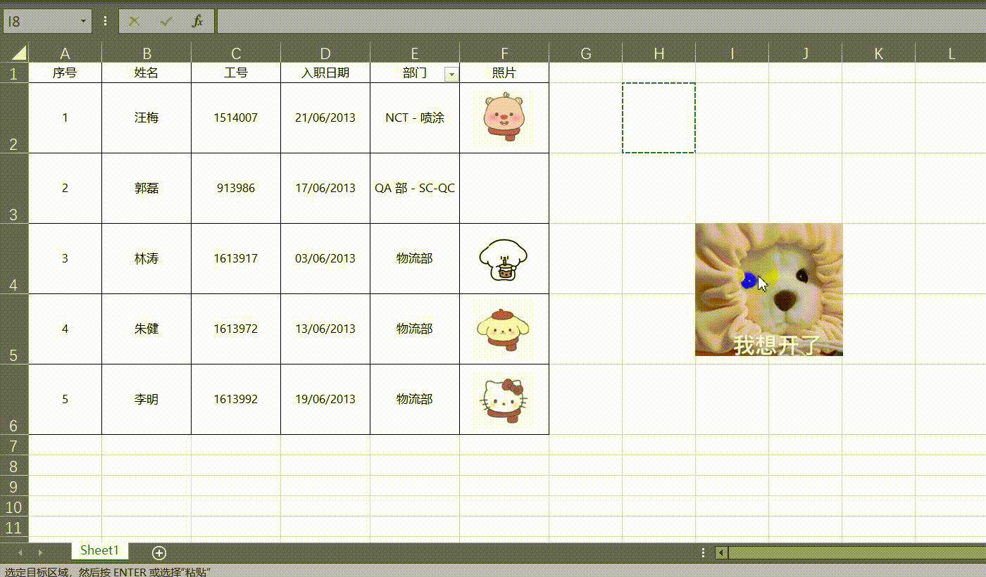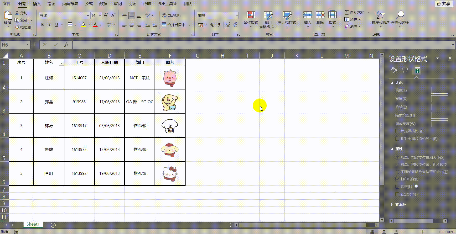 (4)效果:表格仅显示物流部员工行,对应图片随单元格同步隐藏,非物流部的图片自动不显示。