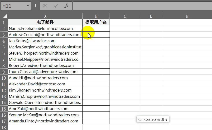 (1)手动选中第一个用户名,复制(Ctrl+C):在"提取用户名"列的第一个单元格中粘贴(Ctrl+V)对应的用户名(如Nancy.Freehafer),按Enter键;