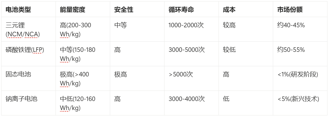 为了更直观地了解不同类型动力电池的性能差异,以下通过表格形式对几种主流电池进行对比: