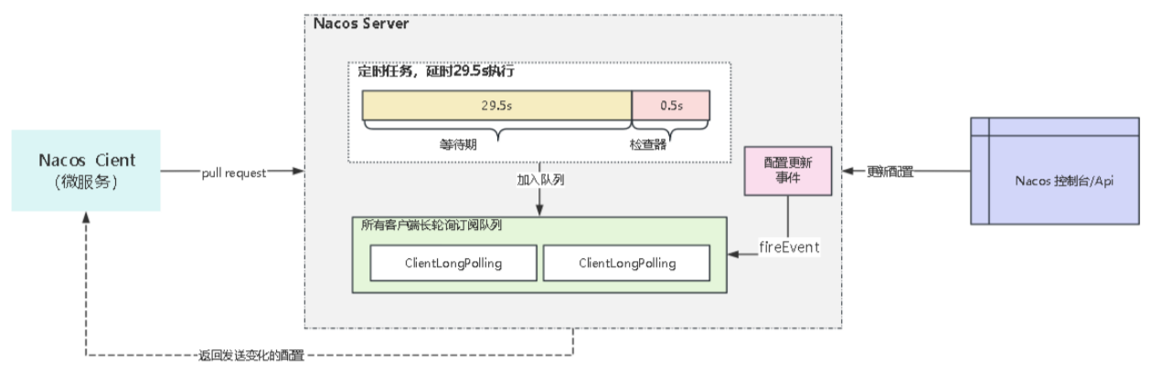 - 配置变化:在 29.5s 内任意一个时刻配置变化,会触发一个事件机制,监听到该事件的任务会遍历 allSubs 队列,找到发生变更的配置项对应的 ClientLongPolling 任务,将变更的数据通过该任务中的连接进行返回。相当于完成了一次 PUSH 操作;