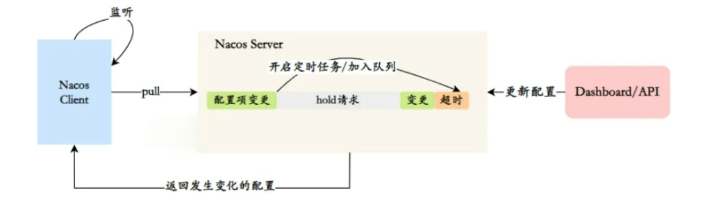 一般来说客户端和服务端的交互分为两种:推(Push)和拉(Pull),Nacos在Pull的基础上,采用了长轮询来进行配置的动态刷新 。 详情可以看这篇文章Nacos交互模型