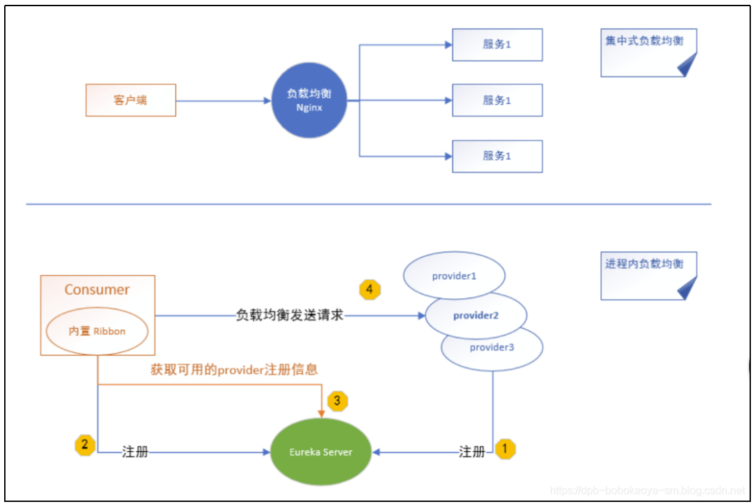 - 集中式负载均衡, 即在 consumer 和 provider 之间使用独立的负载均衡设施(可以是硬件,如F5, 也可以是软件,如 Nginx), 由该设施负责把 访问请求 通过某种策略转发至 provider;