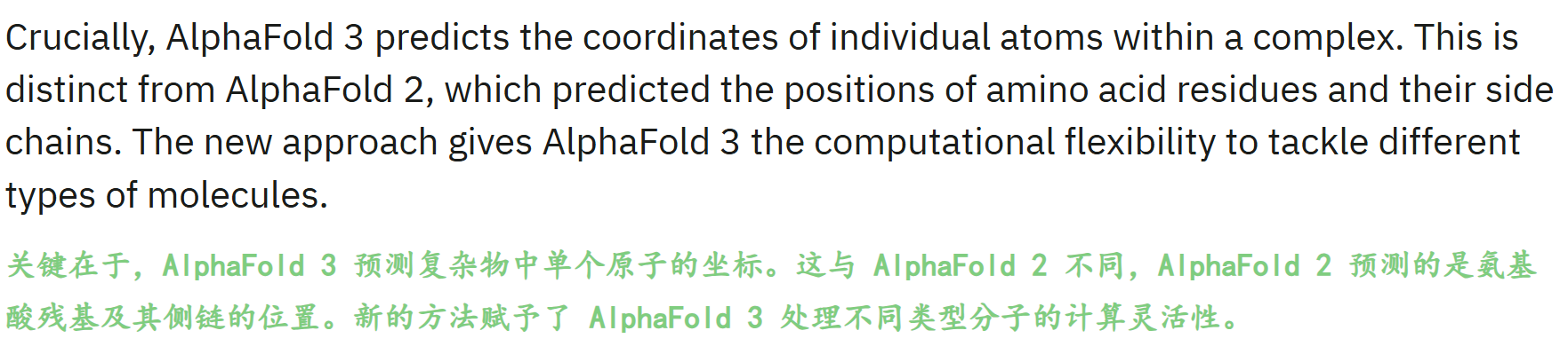 **AlphaFold 3 预测复杂结构中单个原子的坐标,这与 AlphaFold 2 不同,AlphaFold 2 预测的是氨基酸残基及其侧链的位置。