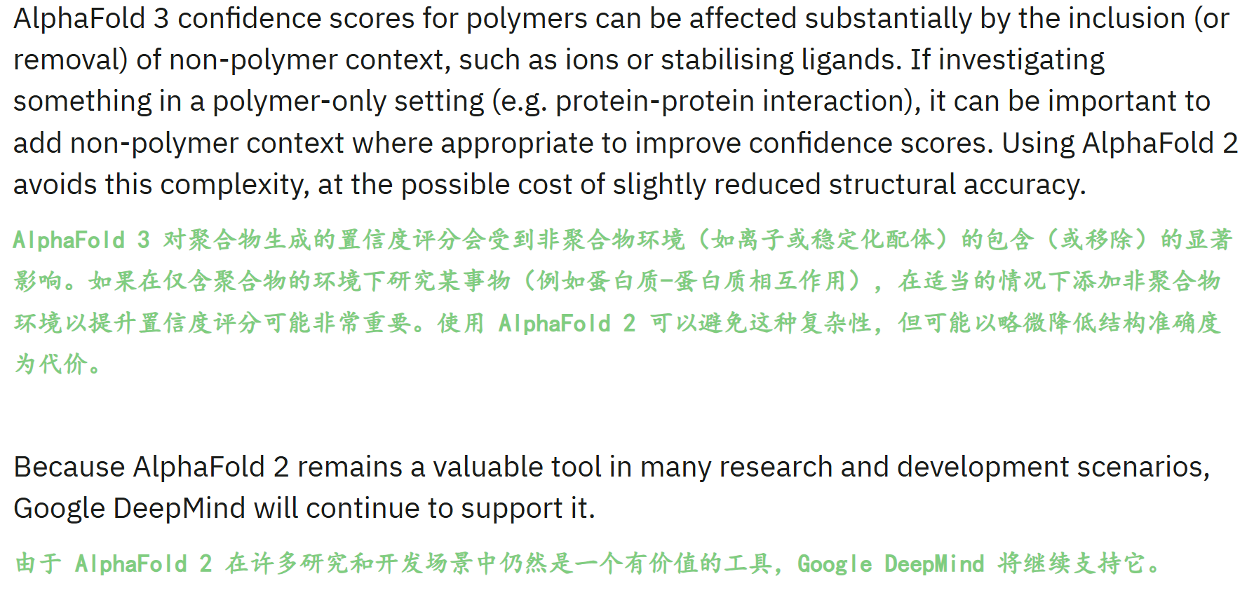 若要在"仅含聚合物"的场景(如研究蛋白质-蛋白质相互作用)中使用它,需根据情况适当添加非聚合物环境,才能让置信度评分更可靠。AlphaFold 2无需考虑"非聚合物环境"的影响,能避开上述操作复杂性,但代价可能是其预测的结构准确度会略低于AlphaFold 3。