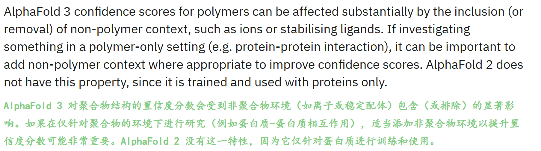 AlphaFold 3对聚合物(如蛋白质)的置信度评分,会受"非聚合物环境"(如离子、稳定配体等)的显著影响------加入或移除这类物质,可能大幅改变评分结果。