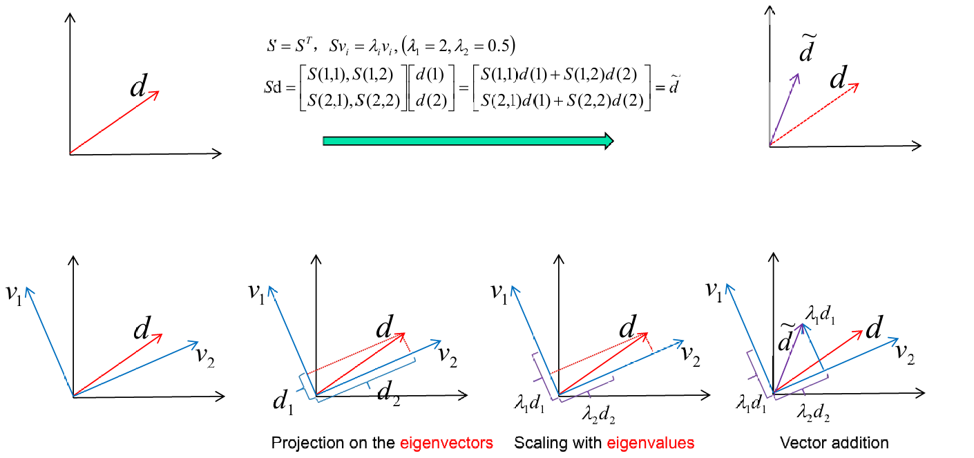 将投影后的向量按对应的特征值 λ 1 \lambda_1 λ1和 λ 2 \lambda_2 λ2缩放,得到 λ 1 d 1 \lambda_1 \mathbf{d}_1 λ1d1和 λ 2 d 2 \lambda_2 \mathbf{d}_2 λ2d2。如下图3所示。