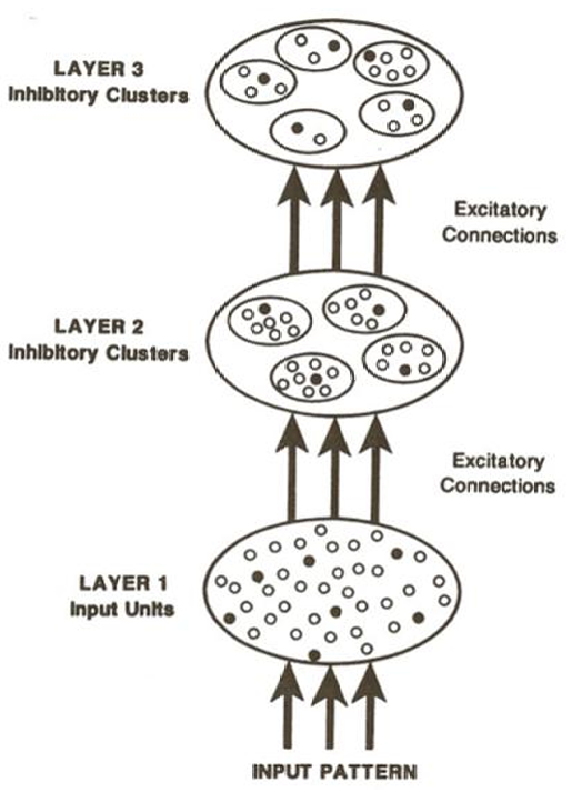层内的连接是抑制性的(inhibitory),每个层由一组相互抑制的簇组成。
