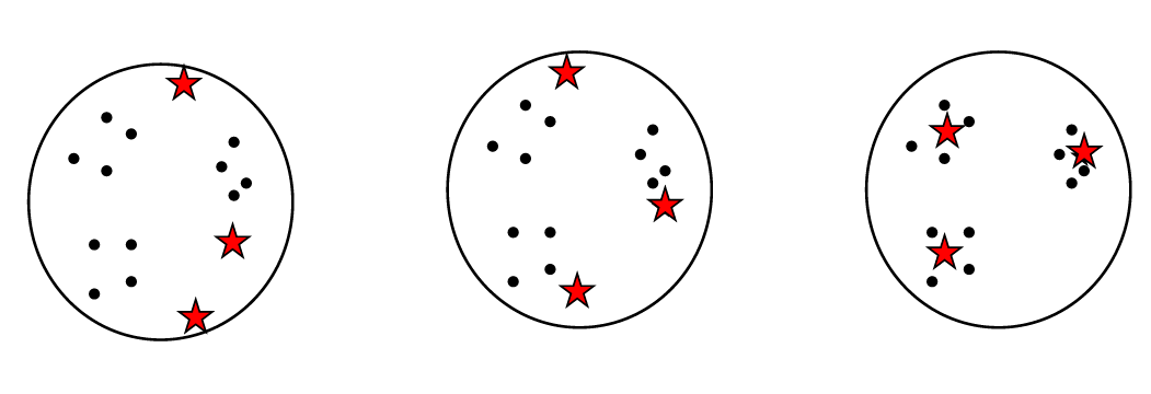 左图:初始状态,输出单元(星形标记)分布在输入向量(黑色点)的不同位置。