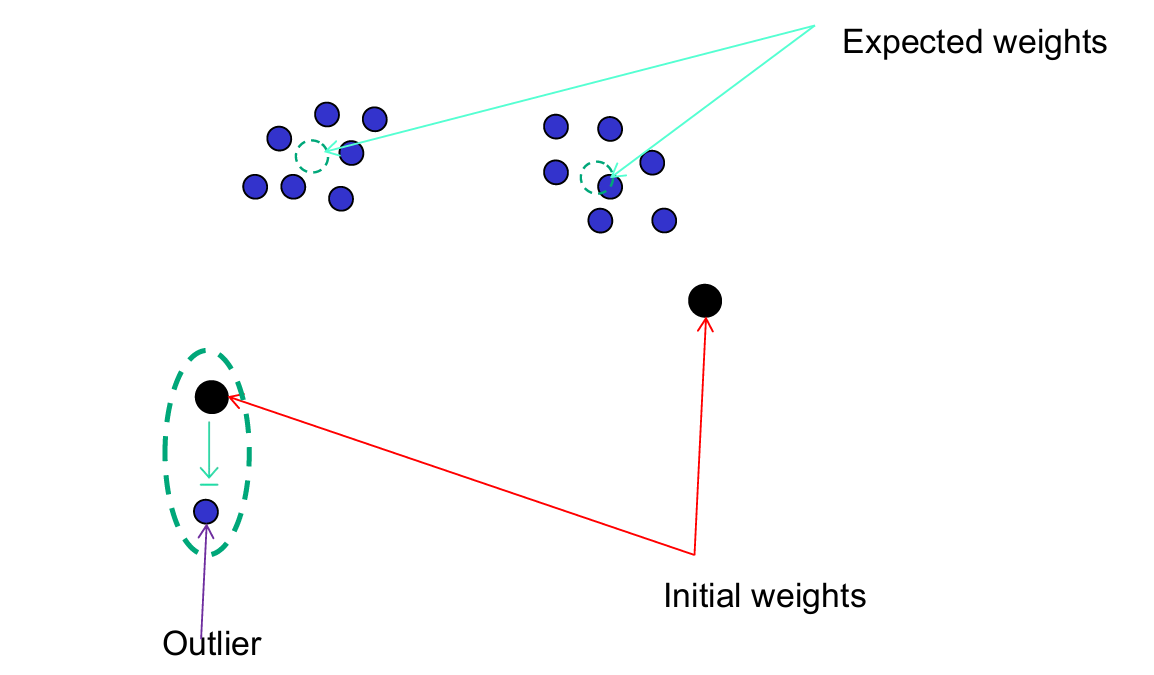 右图:最终状态,输出单元已经移动到输入向量簇的中心,形成清晰的聚类。