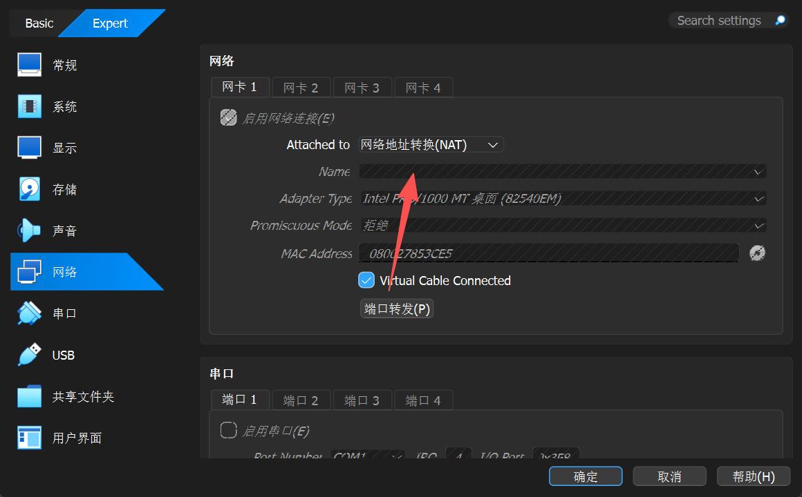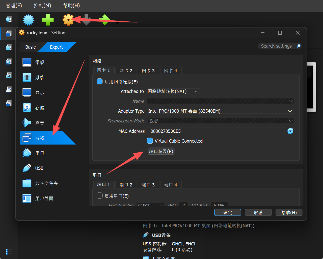 关闭完成后,进入到此虚拟机的网络设置,设置端口转发如下图: