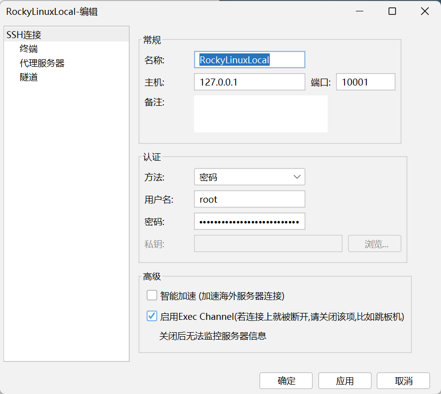步骤二、通过shell工具连接RockyLinux,填写配置如下
