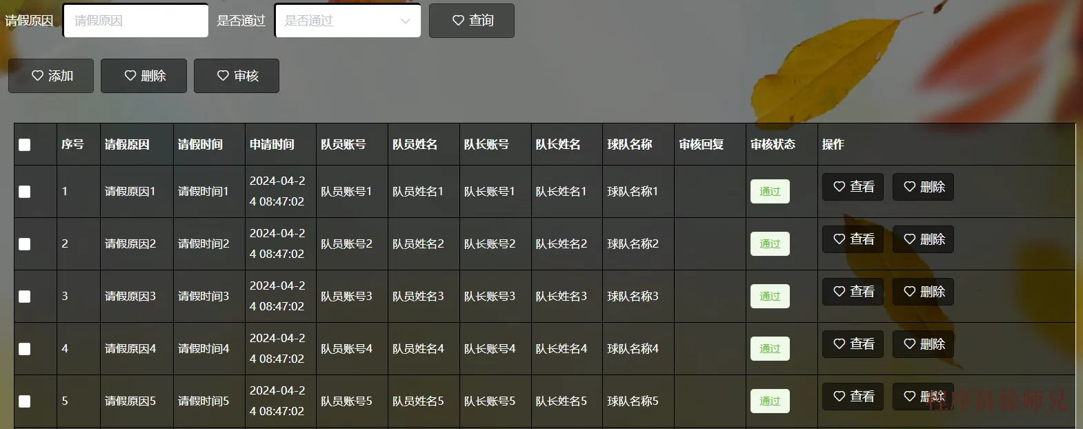 "请假管理"模块让管理员能够查看和处理球队成员的请假请求。管理员访问此模块时,会看到一个请假请求列表。管理员可以通过点击 "审核"按钮来处理这些请假申请。请假管理功能效果图如图4-11所示。