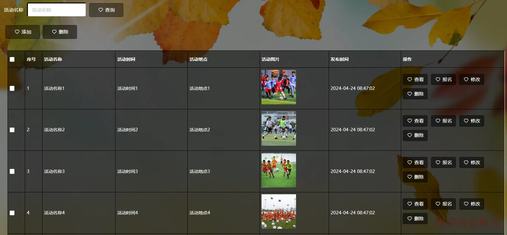 在"日常活动管理"模块中,管理员可以创建、修改或删除日常活动。进入此模块,管理员首先会看到现有的所有活动列表,每项活动都有"修改"和"删除"按钮。点击"修改"可以修改活动的详情。点击"删除"后活动将被删除。管理员还可以通过点击页面上的"添加"按钮,进入填写新活动的相关信息。日常活动管理功能效果图如图4-8所示。