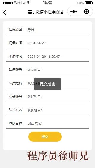 "请假"模块允许用户提交请假申请。用户进入此模块,首先需要填写请假时间和请假原因。填写完毕后,用户可以通过点击"提交"按钮发送请假申请到管理员审核。用户还可以在此模块查看自己的历史请假记录和请假状态。请假功能效果图如图4-6所示。