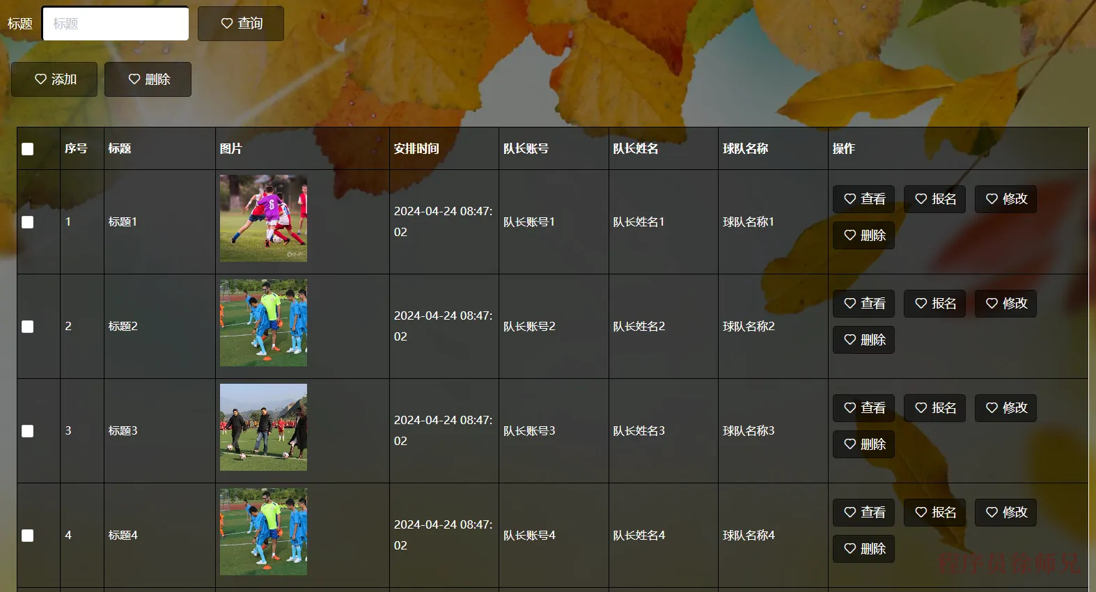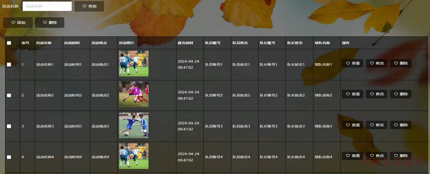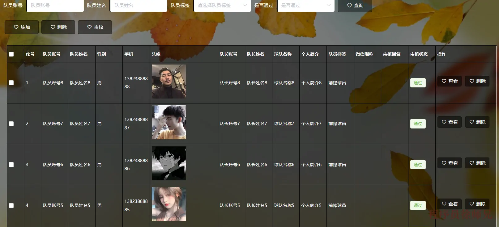 球队队员管理模块允许管理员管理球队的队员信息。管理员进入此模块后,会看到一个队员列表,每个队员旁边有"查看"和"删除"选项。通过点击"编辑",管理员可以查看队员的详细信息。点击"删除"则会弹出确认对话框,确认后即可移除队员。此模块还提供一个"添加"按钮,点击后管理员可以填写新队员的各项信息并提交。球队队员管理功能效果图如图4-7所示。
