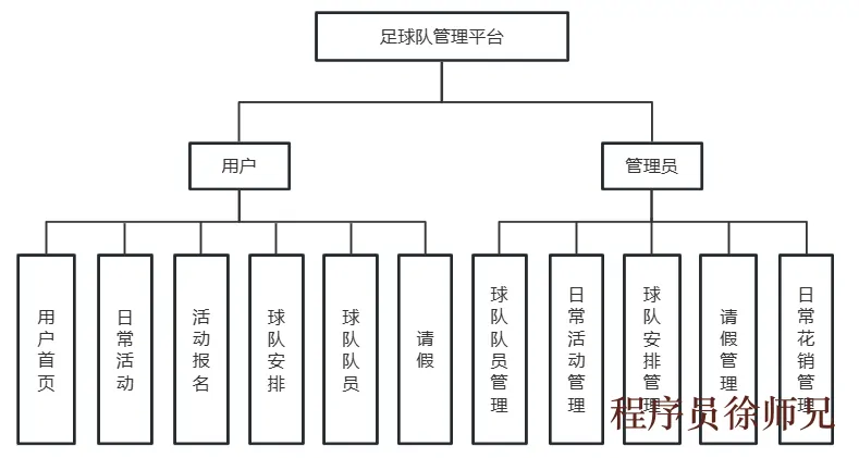 根据系统分析,本系统后台管理端设计为登录、球队队员管理、日常活动管理、活动报名管理、球队安排管理、请假管理、日常花销管理等,其中管理员可以对系统的所有模块进行管理。用户端通过手机或者电脑浏览器访问系统,用户端设计的功能模块有登录或注册、首页、日常活动、活动报名、球队安排、球队队员、请假等。整个系统的功能模块设计如图4-2所示。