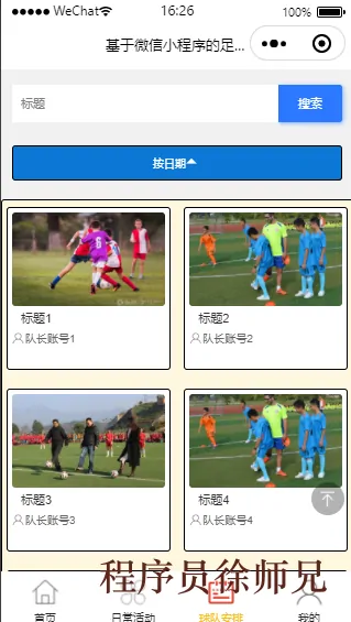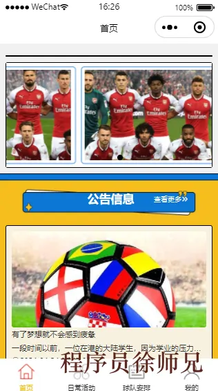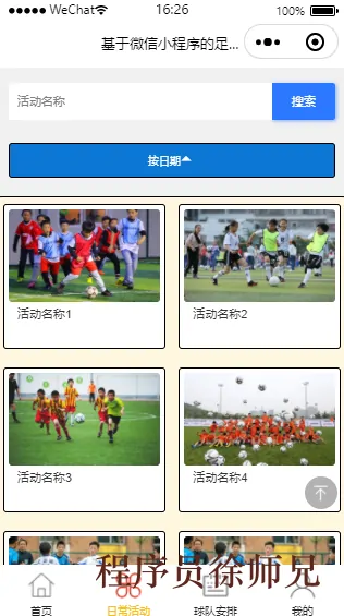 用户打开系统后,首先进入的是首页模块。底部的导航栏可以让用户快速跳转到如"日常活动"、"球队安排"等模块。用户可以通过点击具体的活动,查看活动详情或直接进行报名。用户首页功能效果图如图4-1所示。