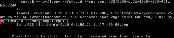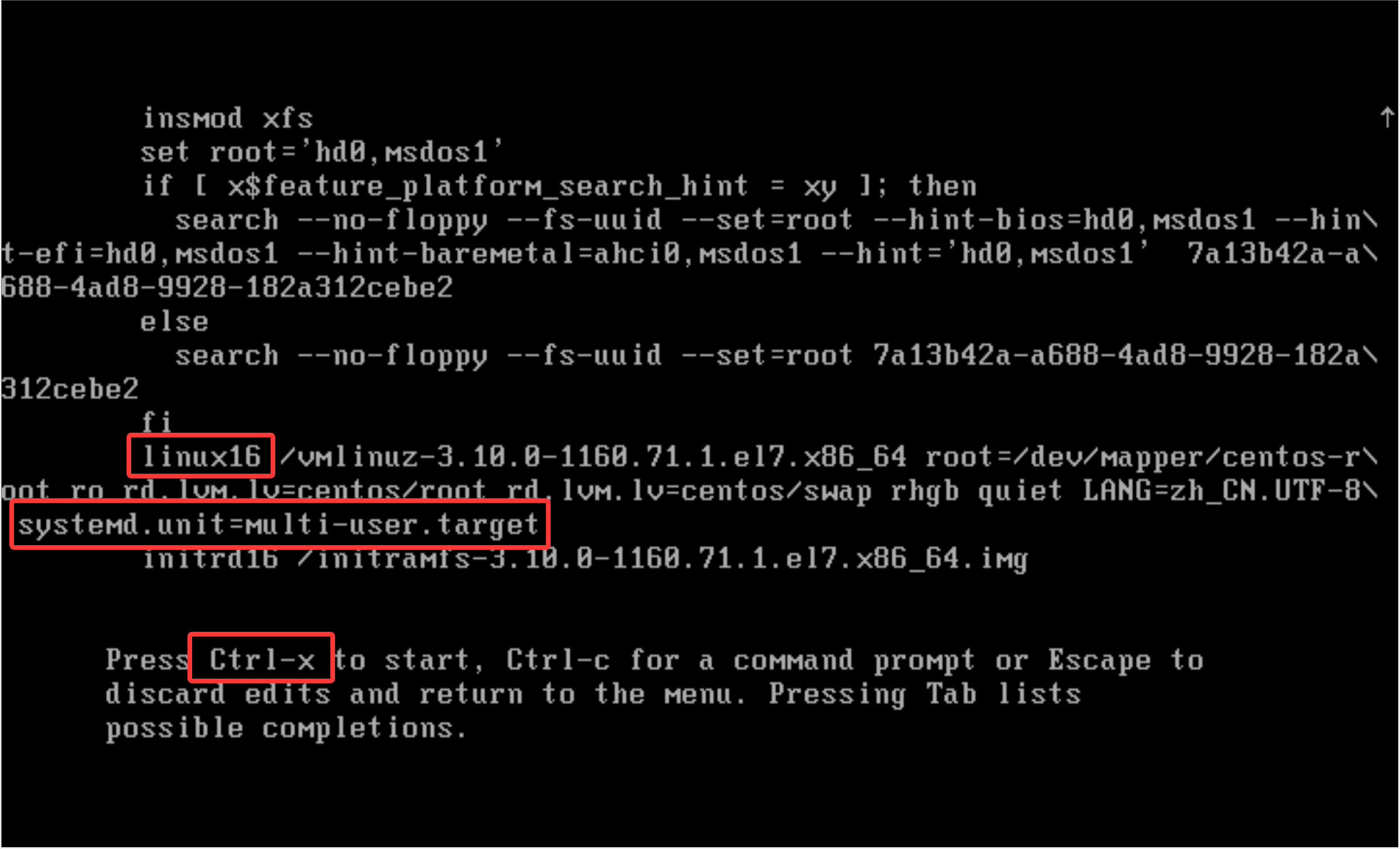 将光标移至以linux16开头的行,末尾附加systemd.unit=target.target。例如,systemd.unit=multi-user.target。按 Ctrl+x 使用这些更改进行启动。