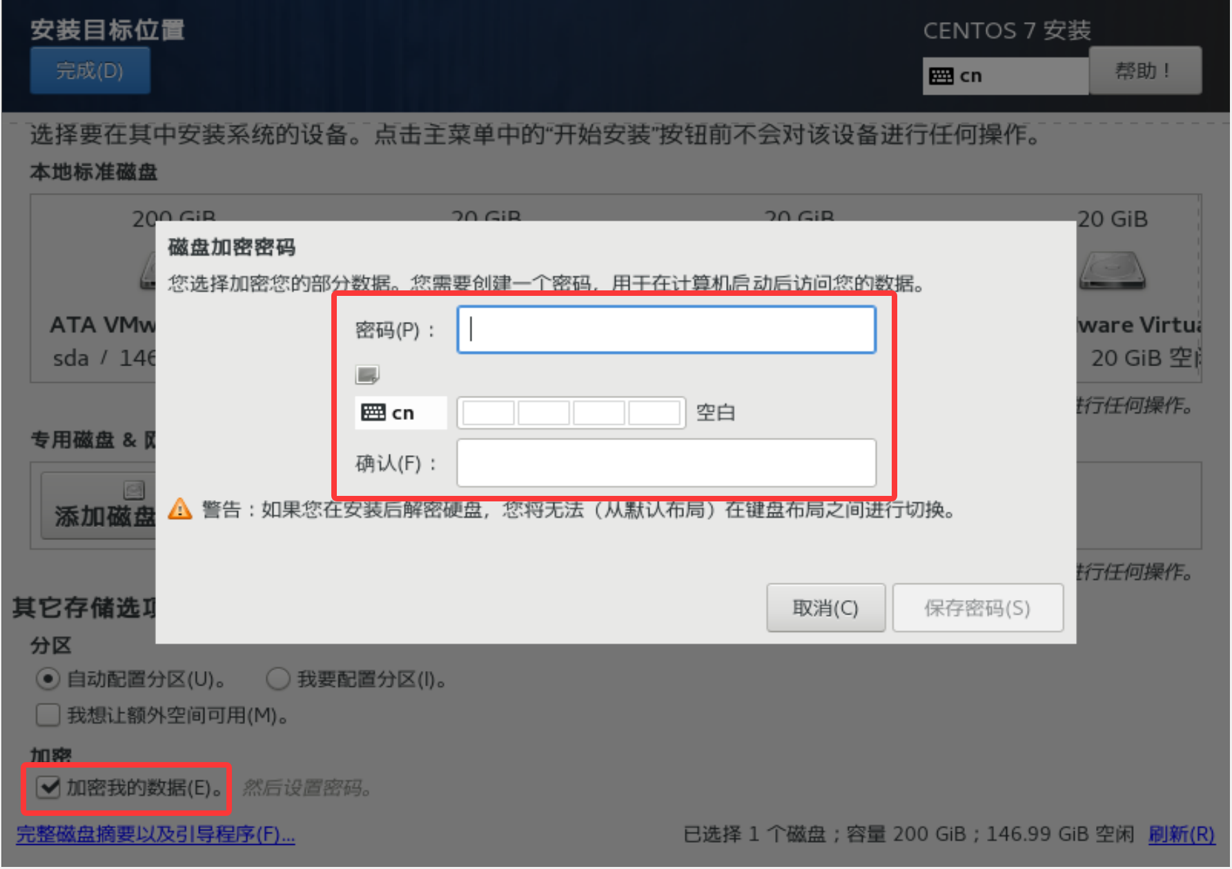 **提示:**该加密操作不会加密grub2系统选择菜单,也就是/boot目录中数据。