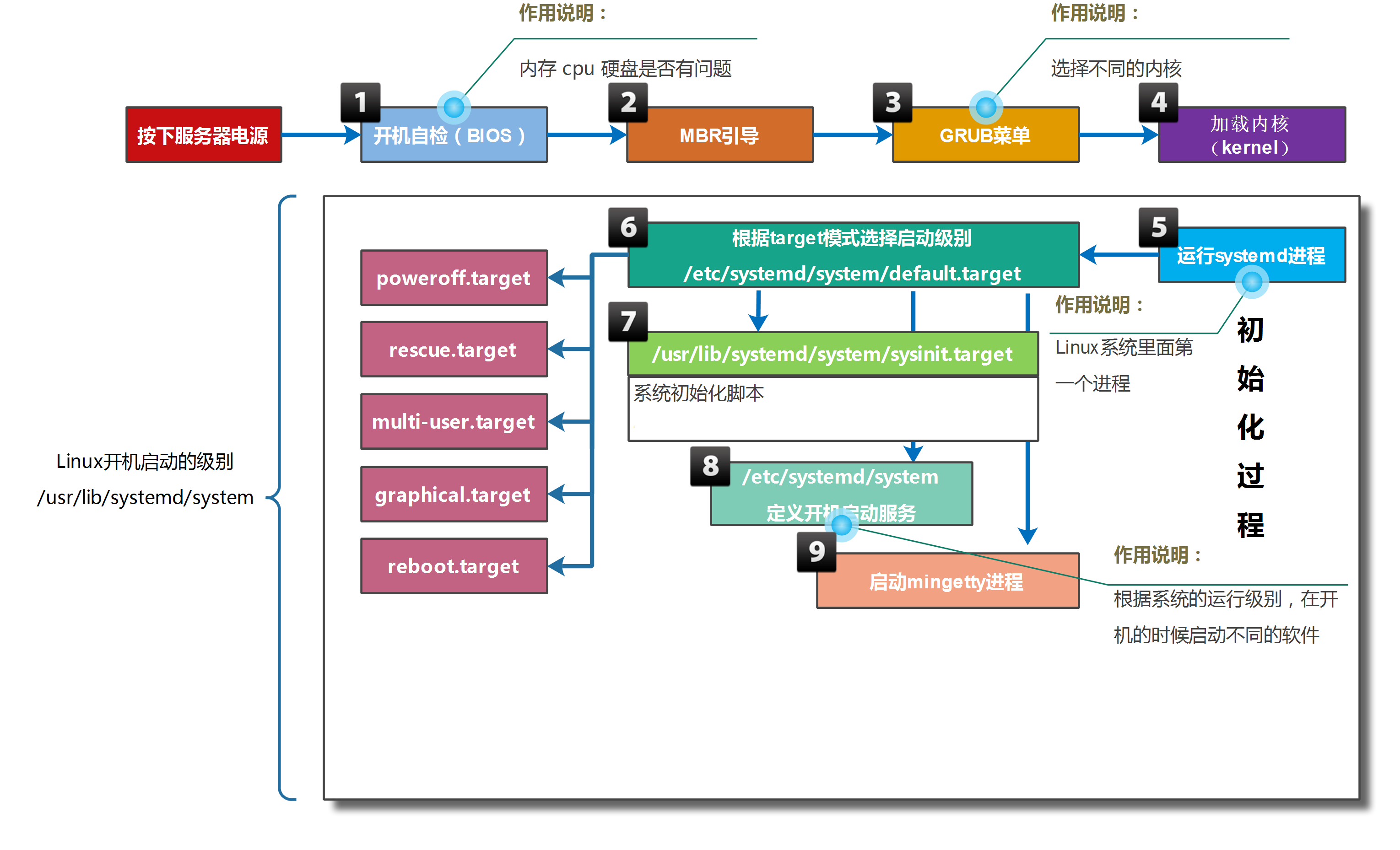 | 1 | emergency.target rescue.target | 单用户模式、救援模式和紧急模式用于修复系统 |