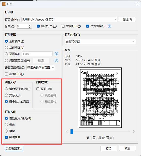 调整大小:推荐选择"适合页面大小",让图纸智能适配纸张,避免内容溢出。
