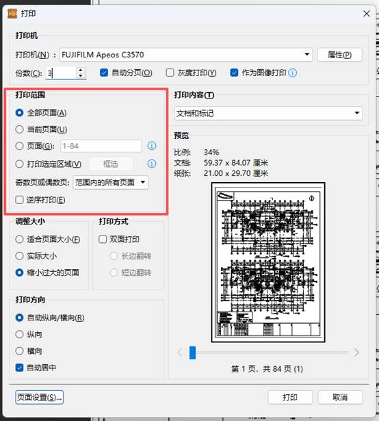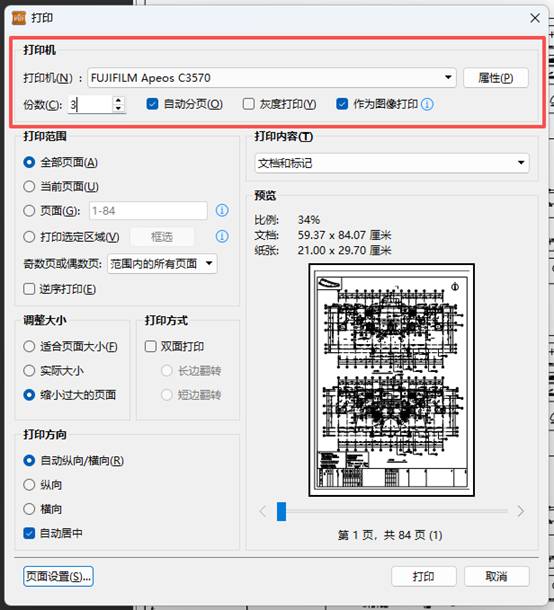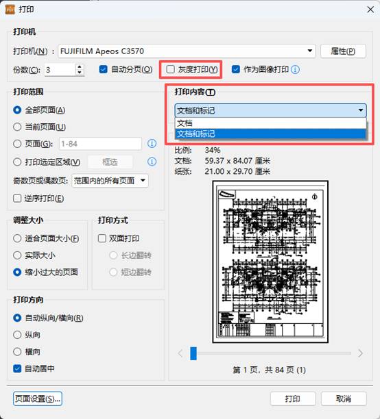 可选择"文档和标记"(同时打印图纸及上面的批注)或"文档"(仅打印纯净图纸)。
