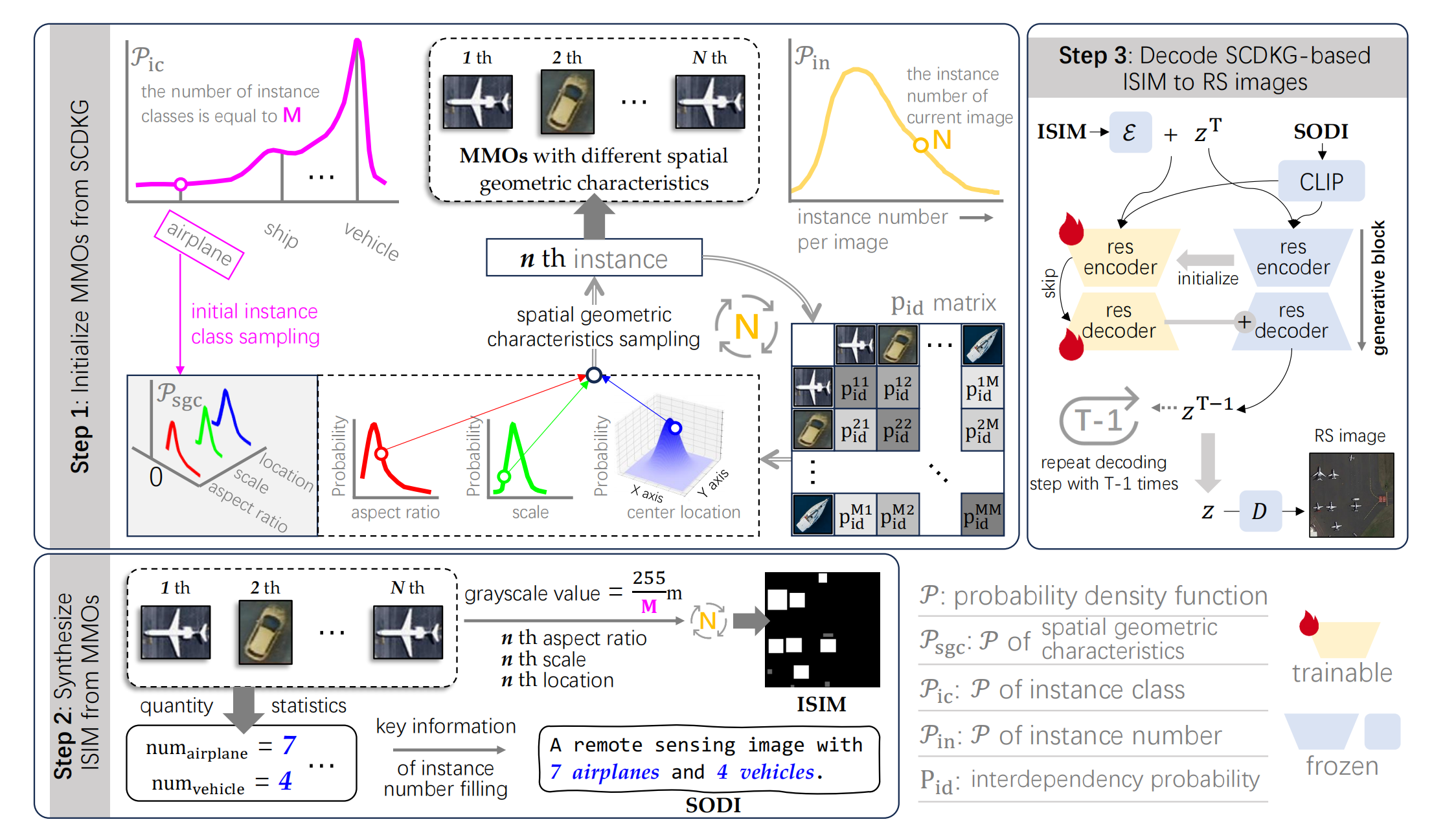 | 2. SODI(结构化文本指令) | 「风格 + 对齐约束」:限定 "遥感图像风格",同时确保生成的目标数量、类别与 ISIM 完全一致(防幻觉) |