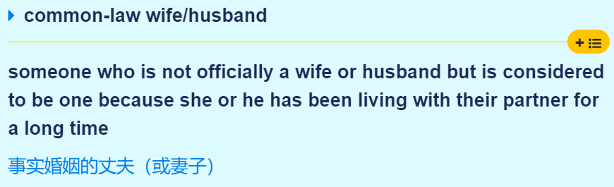 common-law wife/husband 事实婚姻的丈夫(或妻子)