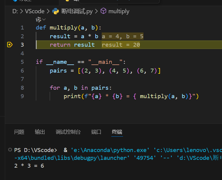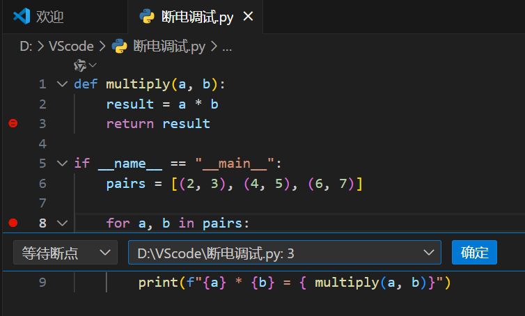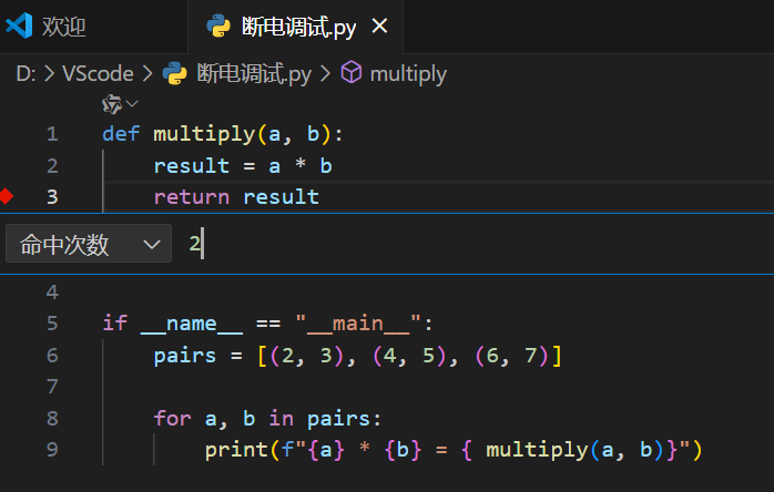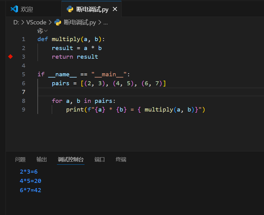 定义了一个名为multiply的函数,该函数接收两个参数并返回它们的乘积;在程序主入口中,通过遍历包含三组数字的列表pairs,循环调用multiply函数计算每组数字的乘积,并将 "数字 A * 数字 B = 乘积" 的格式打印输出。